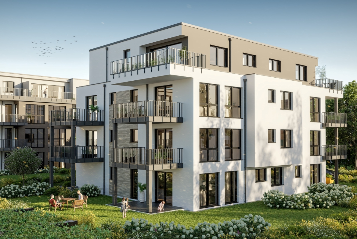 Das 3-geschossige Mehrfamilienhaus gewinnt durch die klare Gliederung der Fassade. Die Wohnungen überzeugen durch ihre gelungene Verbindung von Licht, Exklusivität und optimaler Nutzungsmöglichkeit. Die Wirkung der bodentiefen Fenster mit der feinen Unterteilung wird durch die transparenten Balkonbrüstungen unterstrichen. Farben, Formen und Materialien sind aufeinander abgestimmt. Eine besondere Atmosphäre entsteht zusätzlich in den Staffelgeschoss-Wohnungen.