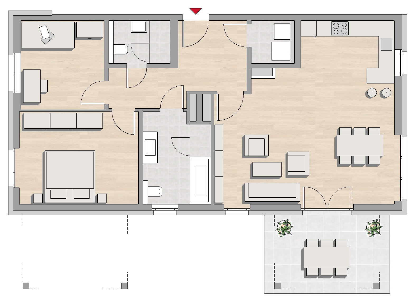 Das Gebäude wird in solider Mauerwerksbauweise errichtet und erfüllt alle Anforderungen gemäß GEG 2024. Fundamente und Bodenplatte in Beton. Die Außenwände sowie die tragenden Innenwände werden aus Kalksandstein bzw. Stahlbeton hergestellt. Die Geschossdecken bestehen aus Stahlbeton. Die Geschosstreppen sind ebenfalls aus Stahlbeton gefertigt. Sie werden mit polierten Granitstufen belegt. Auf das Außenmauerwerk wird ein Wärmedämmverbundsystem (WDVS) aufgebracht.