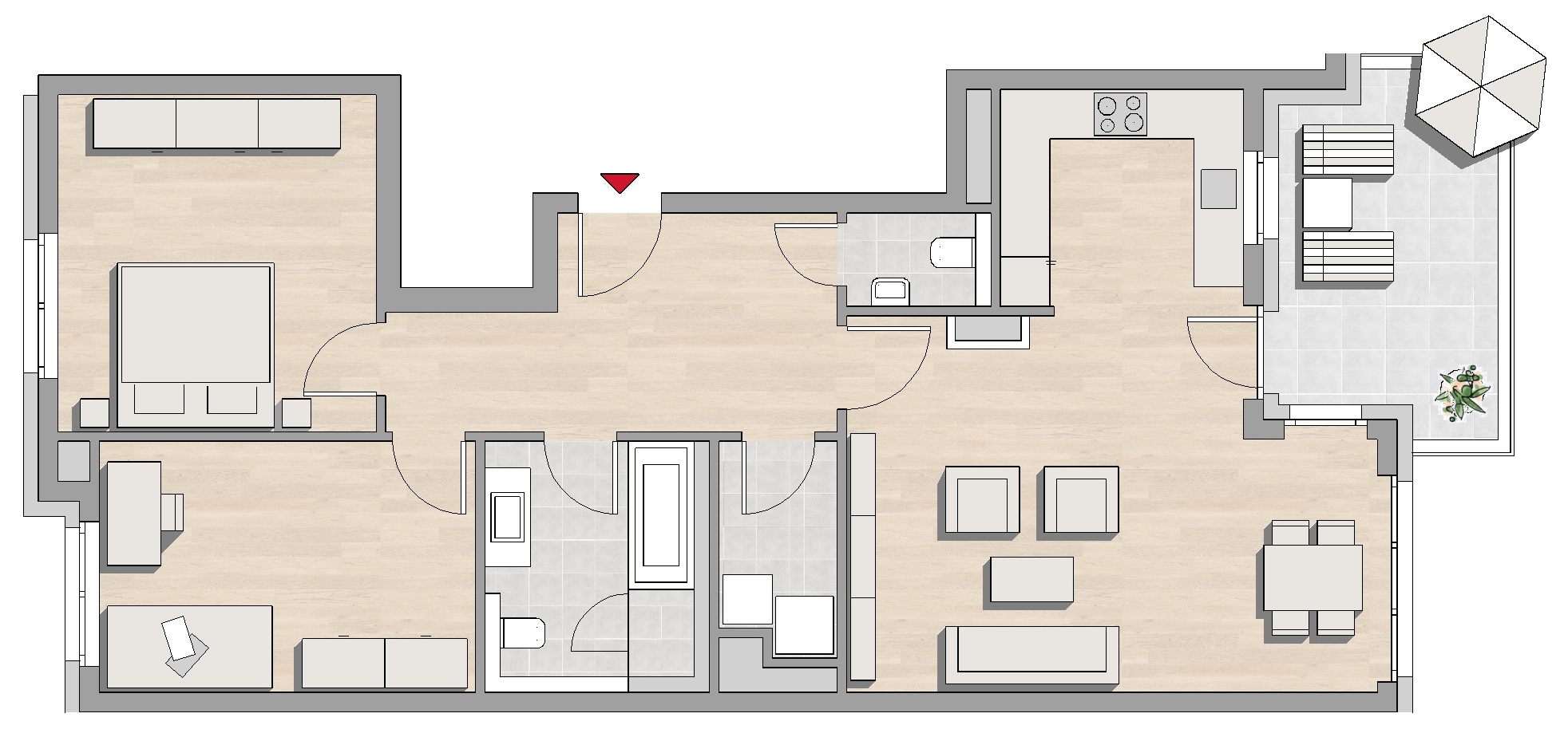 Das Gebäude ist mit viel Gefühl in das Umfeld eingefügt. Die modernen Wohnungen überzeugen durch ihre gelungene Verbindung von Licht, Exklusivität und optimaler Nutzungsmöglichkeit. Die Wirkung der bodentiefen Fenster mit feinen Unterteilungen wird durch die transparenten Balkonbrüstungen unterstrichen. Farben, Formen und Materialien sind harmonisch aufeinander abgestimmt.