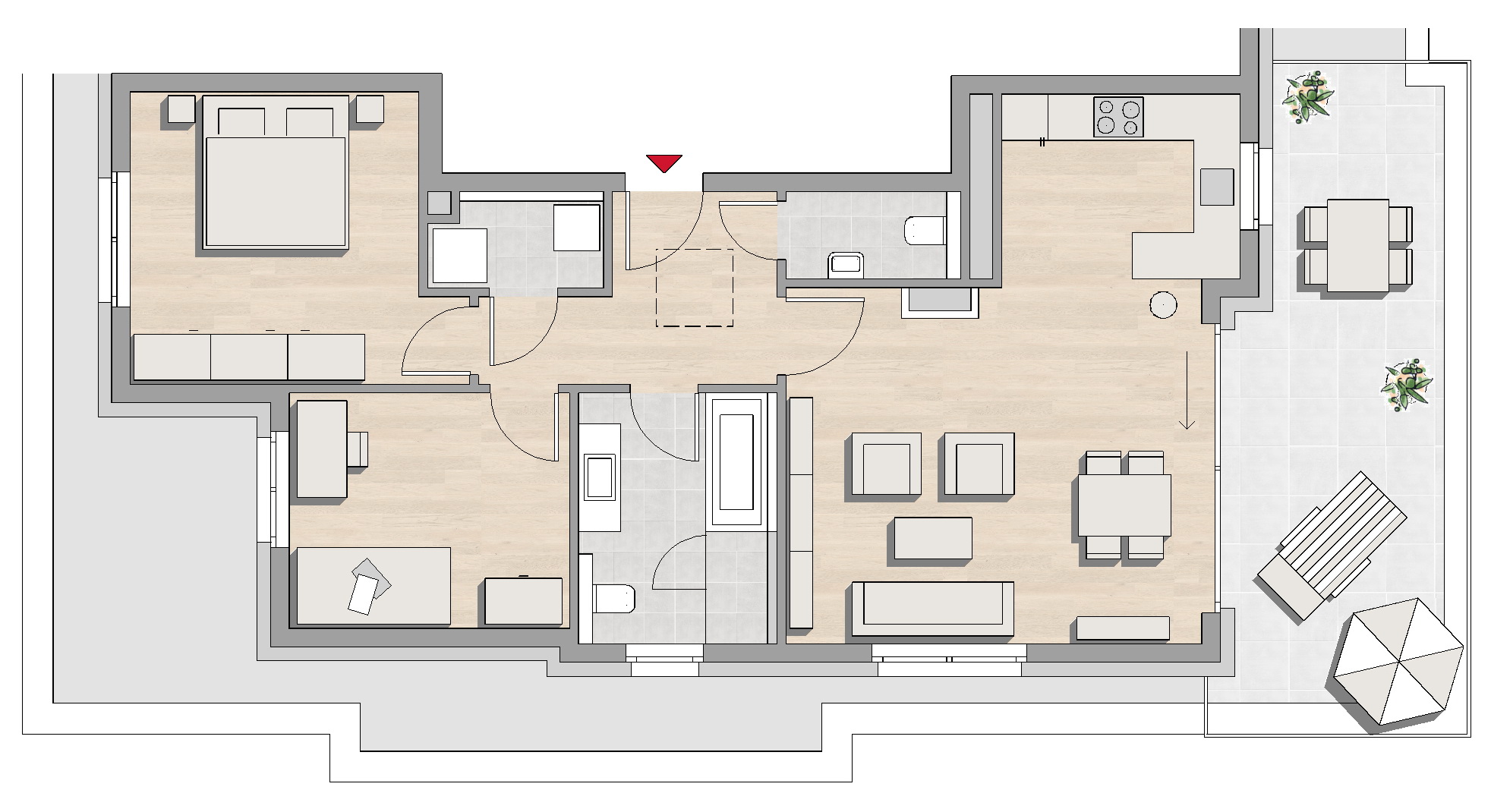 Das Gebäude ist mit viel Gefühl in das Umfeld eingefügt. Die modernen Wohnungen überzeugen durch ihre gelungene Verbindung von Licht, Exklusivität und optimaler Nutzungsmöglichkeit. Die Wirkung der bodentiefen Fenster mit feinen Unterteilungen wird durch die transparenten Balkonbrüstungen unterstrichen. Farben, Formen und Materialien sind harmonisch aufeinander abgestimmt.