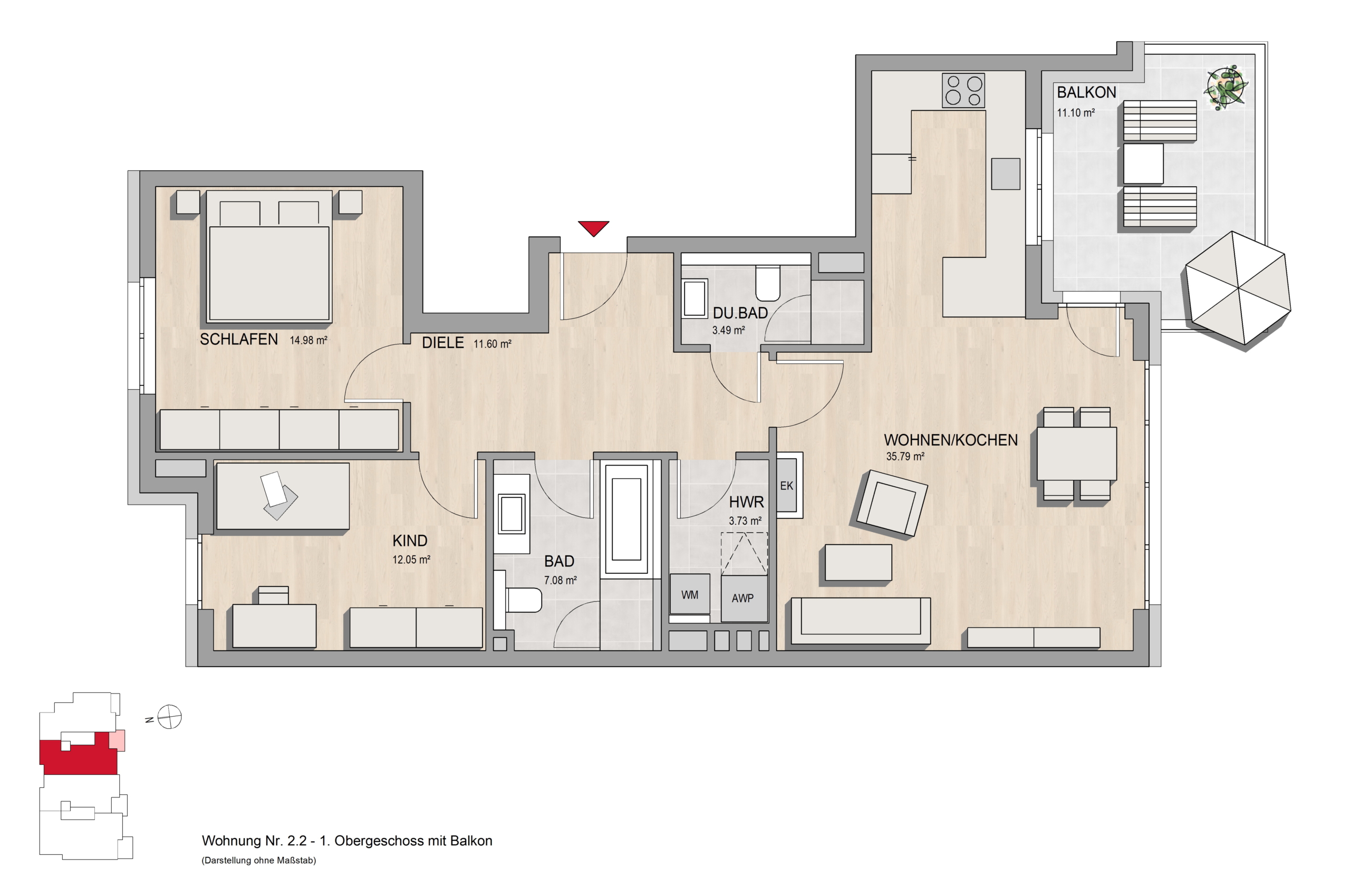 Die Architektur fügt sich durch klare und moderne Fassadengestaltung in ihr Umfeld ein. Die Grundrisse bieten aus lichtdurchfluteter Großzügigkeit und durchdachter Funktionalität ein harmonisches Zusammenspiel. Die bodentiefen Fenster und das transparente Balkongeländer unterstreichen die moderne Leichtigkeit. Farben, Formen und Materialien sind sorgfältig aufeinander abgestimmt und schaffen ein gelungenes Gesamtbild.