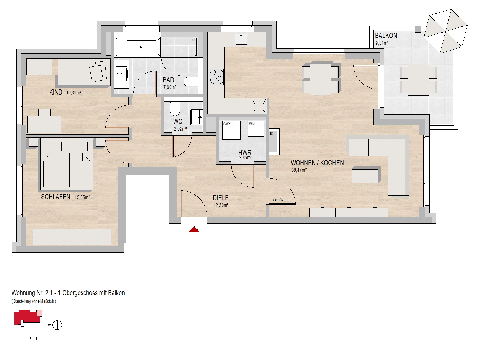 Es werden Kunststoff-Fenster mit Wärmedämmverglasung eingesetzt. Die Beschläge als Einhand-Dreh-Kipp- oder Einhand-Dreh-Beschläge in verdeckter Ausführung. Die Fenster in den Erdgeschoss-Wohnungen und die Fenster im Bereich der Balkone im 1. Obergeschoss erhalten einbruchhemmende Beschläge. Alle Fenster, Balkon- und Terrassentüren der Wohnungen in der senkrechten Fassade erhalten elektrisch betriebene Raffstores aus pulverbeschichtetem Aluminium. Die Badezimmerfenster erhalten eine Verglasung mit satiniertem Glas. Die Wohnungseingangstüren in schallhemmender Ausführung erhalten einen Weitwinkelspion. Zu Ihrer Sicherung sind eine Mehrfachverriegelung sowie eine Türsprechanlage mit integriertem Videoüberwachungssystem vorgesehen. Die Bäder, Duschbäder und WCs werden im Bereich der Dusche raumhoch gefliest, der Rest bis Oberkante Vorwand. Der bodengleiche Duschbereich mit Ablaufrinne und Fliesenmulde erhält eine Klarglas-Duschabtrennung. Über der Waschtischanlage wird in gleicher Breite ein beleuchteter Spiegel montiert. Moderne Deckenspots sorgen für das passende Licht im Bad. Bäder, Duschbäder, WCs, und HWR erhalten Bodenfliesen. Die Wohn- Koch- und Schlafbereiche sowie Dielen, Flure und Abstellräume erhalten einen Bodenbelag nach Mustervorlage mit passender Sockelleiste. Decken und Wände der Wohnungen werden mit Raufaser tapeziert und weiß angelegt. Die Wohnung ist mit einem Multimedia-Verteilerkasten sowie einer großen Zahl Elektroschaltern und Steckdosen ausgestattet. Telefonanschlüsse und TV-Kabel nach Wahl. In jeder Wohnung wird im Hauswirtschaftsraum eine Abluftwärmepumpe für die Warmwasserbereitung zum Heizen und zum Lüften installiert. Auf dem Dach wird eine Photovoltaik-Anlage zur Stromerzeugung installiert. Die Räume der Wohnungen werden mit einer Fußbodenheizung beheizt. Die Regelung der Fußbodenheizung erfolgt über Raumthermostate individuell. Die Wohnungen erhalten einen elektrisch betriebenen Kamin im Stil eines offenen Kamins. Zu jeder Wohnung gehört ein Kellerraum. Für die Bewohner des Hauses steht ein Gemeinschaftsraum für Fahrräder zur Verfügung. Ein Personenaufzug, für bis zu 8 Personen, verbindet alle Etagen des Hauses miteinander. Der Aufzug ist von der Untergeschossebene, den Hauseingängen und in den Geschossen stufenfrei erreichbar. Zur Erhöhung Ihrer Sicherheit wird der Zugang von der Tiefgarage ins Haus alarmgesichert.