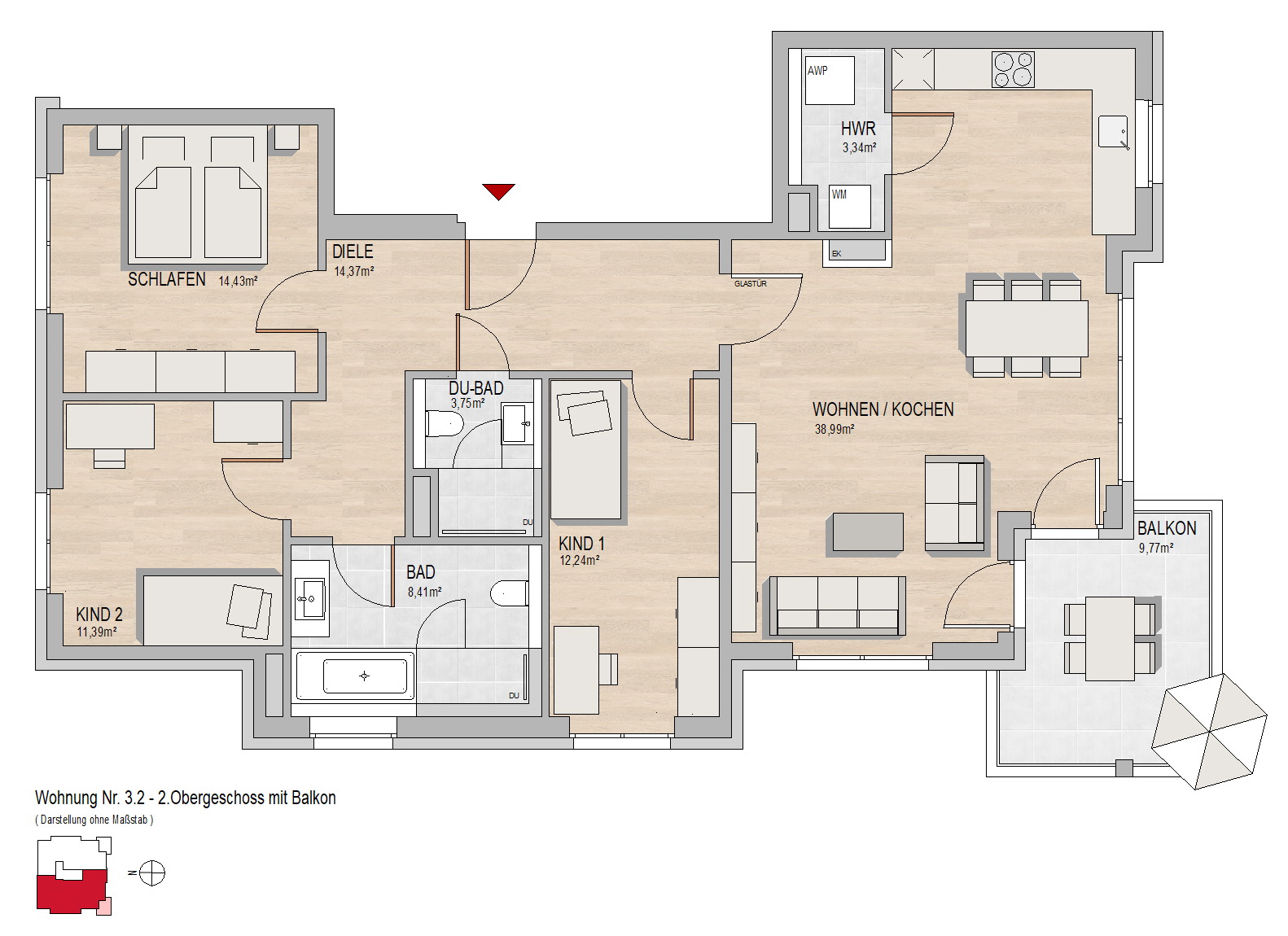 Es werden Kunststoff-Fenster mit Wärmedämmverglasung eingesetzt. Die Beschläge als Einhand-Dreh-Kipp- oder Einhand-Dreh-Beschläge in verdeckter Ausführung. Die Fenster in den Erdgeschoss-Wohnungen und die Fenster im Bereich der Balkone im 1. Obergeschoss erhalten einbruchhemmende Beschläge. Alle Fenster, Balkon- und Terrassentüren der Wohnungen in der senkrechten Fassade erhalten elektrisch betriebene Raffstores aus pulverbeschichtetem Aluminium. Die Badezimmerfenster erhalten eine Verglasung mit satiniertem Glas. Die Wohnungseingangstüren in schallhemmender Ausführung erhalten einen Weitwinkelspion. Zu Ihrer Sicherung sind eine Mehrfachverriegelung sowie eine Türsprechanlage mit integriertem Videoüberwachungssystem vorgesehen. Die Bäder, Duschbäder und WCs werden im Bereich der Dusche raumhoch gefliest, der Rest bis Oberkante Vorwand. Der bodengleiche Duschbereich mit Ablaufrinne und Fliesenmulde erhält eine Klarglas-Duschabtrennung. Über der Waschtischanlage wird in gleicher Breite ein beleuchteter Spiegel montiert. Moderne Deckenspots sorgen für das passende Licht im Bad. Bäder, Duschbäder, WCs, und HWR erhalten Bodenfliesen. Die Wohn- Koch- und Schlafbereiche sowie Dielen, Flure und Abstellräume erhalten einen Bodenbelag nach Mustervorlage mit passender Sockelleiste. Decken und Wände der Wohnungen werden mit Raufaser tapeziert und weiß angelegt. Die Wohnung ist mit einem Multimedia-Verteilerkasten sowie einer großen Zahl Elektroschaltern und Steckdosen ausgestattet. Telefonanschlüsse und TV-Kabel nach Wahl. In jeder Wohnung wird im Hauswirtschaftsraum eine Abluftwärmepumpe für die Warmwasserbereitung zum Heizen und zum Lüften installiert. Auf dem Dach wird eine Photovoltaik-Anlage zur Stromerzeugung installiert. Die Räume der Wohnungen werden mit einer Fußbodenheizung beheizt. Die Regelung der Fußbodenheizung erfolgt über Raumthermostate individuell. Die Wohnungen erhalten einen elektrisch betriebenen Kamin im Stil eines offenen Kamins. Zu jeder Wohnung gehört ein Kellerraum. Für die Bewohner des Hauses steht ein Gemeinschaftsraum für Fahrräder zur Verfügung. Ein Personenaufzug, für bis zu 8 Personen, verbindet alle Etagen des Hauses miteinander. Der Aufzug ist von der Untergeschossebene, den Hauseingängen und in den Geschossen stufenfrei erreichbar. Zur Erhöhung Ihrer Sicherheit wird der Zugang von der Tiefgarage ins Haus alarmgesichert.