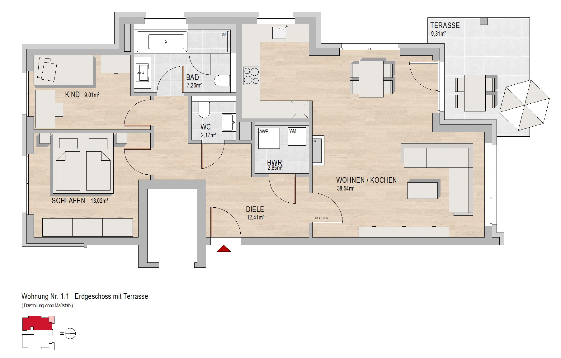 Es werden Kunststoff-Fenster mit Wärmedämmverglasung eingesetzt. Die Beschläge als Einhand-Dreh-Kipp- oder Einhand-Dreh-Beschläge in verdeckter Ausführung. Die Fenster in den Erdgeschoss-Wohnungen und die Fenster im Bereich der Balkone im 1. Obergeschoss erhalten einbruchhemmende Beschläge. Alle Fenster, Balkon- und Terrassentüren der Wohnungen in der senkrechten Fassade erhalten elektrisch betriebene Raffstores aus pulverbeschichtetem Aluminium. Die Badezimmerfenster erhalten eine Verglasung mit satiniertem Glas. Die Wohnungseingangstüren in schallhemmender Ausführung erhalten einen Weitwinkelspion. Zu Ihrer Sicherung sind eine Mehrfachverriegelung sowie eine Türsprechanlage mit integriertem Videoüberwachungssystem vorgesehen. Die Bäder, Duschbäder und WCs werden im Bereich der Dusche raumhoch gefliest, der Rest bis Oberkante Vorwand. Der bodengleiche Duschbereich mit Ablaufrinne und Fliesenmulde erhält eine Klarglas-Duschabtrennung. Über der Waschtischanlage wird in gleicher Breite ein beleuchteter Spiegel montiert. Moderne Deckenspots sorgen für das passende Licht im Bad. Bäder, Duschbäder, WCs, und HWR erhalten Bodenfliesen. Die Wohn- Koch- und Schlafbereiche sowie Dielen, Flure und Abstellräume erhalten einen Bodenbelag nach Mustervorlage mit passender Sockelleiste. Decken und Wände der Wohnungen werden mit Raufaser tapeziert und weiß angelegt. Die Wohnung ist mit einem Multimedia-Verteilerkasten sowie einer großen Zahl Elektroschaltern und Steckdosen ausgestattet. Telefonanschlüsse und TV-Kabel nach Wahl. In jeder Wohnung wird im Hauswirtschaftsraum eine Abluftwärmepumpe für die Warmwasserbereitung zum Heizen und zum Lüften installiert. Auf dem Dach wird eine Photovoltaik-Anlage zur Stromerzeugung installiert. Die Räume der Wohnungen werden mit einer Fußbodenheizung beheizt. Die Regelung der Fußbodenheizung erfolgt über Raumthermostate individuell. Die Wohnungen erhalten einen elektrisch betriebenen Kamin im Stil eines offenen Kamins. Zu jeder Wohnung gehört ein Kellerraum. Für die Bewohner des Hauses steht ein Gemeinschaftsraum für Fahrräder zur Verfügung. Ein Personenaufzug, für bis zu 8 Personen, verbindet alle Etagen des Hauses miteinander. Der Aufzug ist von der Untergeschossebene, den Hauseingängen und in den Geschossen stufenfrei erreichbar. Zur Erhöhung Ihrer Sicherheit wird der Zugang von der Tiefgarage ins Haus alarmgesichert.