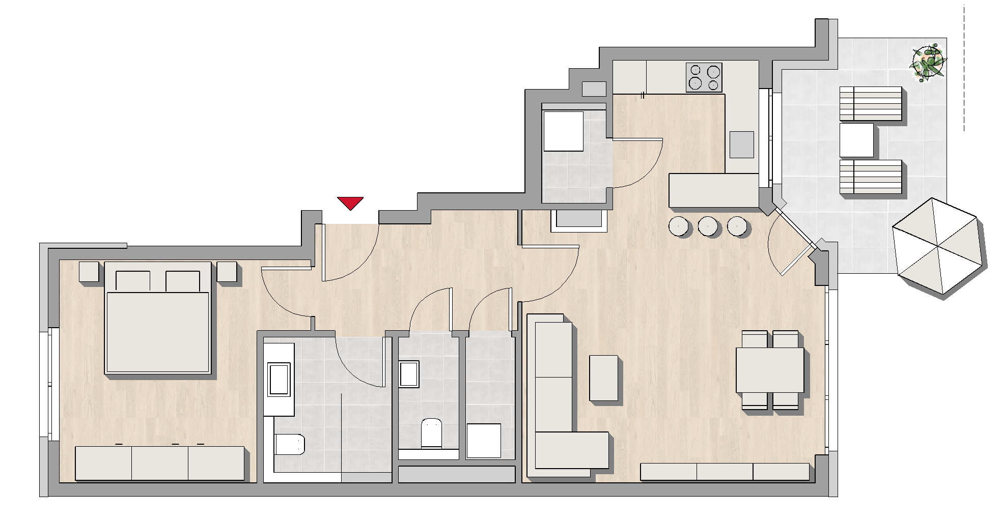 Es werden Kunststoff-Fenster mit Wärmedämmverglasung eingesetzt. Die Beschläge als Einhand-Dreh-Kipp- oder Einhand-Dreh-Beschläge in verdeckter Ausführung. Die Fenster in den Erdgeschoss-Wohnungen und die Fenster im Bereich der Loggien und Dachterrassen im Obergeschoss erhalten einbruchhemmende Beschläge. Alle Fenster, Loggien- und Terrassen- und Dachterrassentüren der Wohnungen in der senkrechten Fassade erhalten elektrisch betriebene Raffstores aus pulverbeschichtetem Aluminium. Die Badezimmer- und WC Fenster in der Fassade werden in satiniertem Glas ausgeführt. Die Wohnungseingangstüren in schallhemmender Ausführung erhalten einen Weitwinkelspion. Zu Ihrer Sicherung sind eine Mehrfachverriegelung sowie eine Türsprechanlage mit integriertem Videoüberwachungssystem vorgesehen. Die Bäder und WCs werden im Bereich der Dusche raumhoch und die restlichen Wände bis Oberkante Vorwand ausgeführt. Die Bäder sind mit Badewanne und Dusche ausgestattet. Der bodengleich geflieste Duschbereich mit Ablaufrinne und Fliesenmulde erhält eine Klarglas-Duschabtrennung. Oberhalb der Waschtischplatte wird in gleicher Breite ein beleuchteter Spiegel montiert. Die Bäder, Duschbäder, WCs und HWRs erhalten Fliesenboden. Die Wohn-, Koch-, Kind- und Schlafbereiche sowie die Dielen und Abstellräume erhalten Bodenbelag nach Mustervorlage mit passender Sockelleiste. Decken und Wände der Wohnungen werden mit Raufasertapete tapeziert und weiß angelegt. Die Wohnung ist mit einem Multimedia-Verteilerkasten sowie einer großen Zahl Elektroschaltern (Großflächenschalter) und Steckdosen ausgestattet. In jeder Wohnung befindet sich eine Datendose für Telefon- und Internet sowie ein TV-Kabelanschluss. In jeder Wohnung wird im Hauswirtschaftsraum eine Abluftwärmepumpe für die Warmwasserbereitung zum Heizen und zum Lüften installiert. Auf dem Dach wird eine Photovoltaik-Anlage zur Stromerzeugung installiert. Die Räume der Wohnungen werden mit einer Fußbodenheizung beheizt. Die Steuerung der Temperatur erfolgt in jedem Raum individuell. Die Wohnungen erhalten einen elektrisch betriebenen Kamin im Stil eines offenen Kamins. Zu jeder Wohnung gehört ein Kellerraum. Für die Bewohner des Hauses steht ein Gemeinschaftsraum zur Verfügung. Drei Personenaufzüge für bis zu 8 Personen verbindet alle Etagen des Hauses miteinander. Der Aufzug ist von der Untergeschossebene, den Hauseingängen und in den Geschossen stufenfrei erreichbar. Zur Erhöhung Ihrer Sicherheit wird der Zugang von der Tiefgarage ins Haus alarmgesichert. Um Ihnen die Wahl unter den Mustern und Farben zu erleichtern haben wir in unserer Firmenzentrale einen Bemusterungsbereich eingerichtet. Hier können Sie in aller Ruhe mit fachmännischer Beratung das für Sie Passende auswählen.