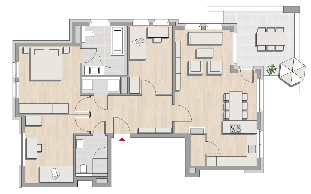 Es werden Kunststoff-Fenster mit Wärmedämmverglasung eingesetzt. Die Beschläge als Einhand-Dreh-Kipp- oder Einhand-Dreh-Beschläge in verdeckter Ausführung. Die Fenster in den Erdgeschoss-Wohnungen und die Fenster im Bereich der Loggien im Obergeschoss erhalten einbruchhemmende Beschläge. Alle Fenster, Balkon- und Terrassentüren der Wohnungen in der senkrechten Fassade erhalten elektrisch betriebene Raffstores aus pulverbeschichtetem Aluminium. Die Badezimmerfenster in der Fassade werden in satiniertem Glas ausgeführt. Die Wohnungseingangstüren in schallhemmender Ausführung erhalten einen Weitwinkelspion. Zu Ihrer Sicherung sind eine Mehrfachverriegelung sowie eine Türsprechanlage mit integriertem Videoüberwachungssystem vorgesehen. Die Bäder und WCs werden im Bereich der Dusche raumhoch und die restlichen Wände bis Oberkante Vorwand ausgeführt. Die Bäder sind mit Badewanne und Dusche ausgestattet. Der bodengleich geflieste Duschbereich mit Ablaufrinne und Fliesenmulde erhält eine Klarglas-Duschabtrennung. Über der Waschtischanlage wird in gleicher Breite ein Lichtspiegel montiert. Die Bäder, Duschbäder, WCs und HWRs erhalten Fliesenboden. Die Wohn-, Koch-, Kind- und Schlafbereiche sowie die Dielen und Abstellräume erhalten Bodenbelag nach Mustervorlage mit passender Sockelleiste. Decken und Wände der Wohnungen werden mit Raufasertapete tapeziert und weiß angelegt. Die Wohnung ist mit einem Multimedia-Verteilerkasten sowie einer großen Zahl Elektroschaltern (Großflächenschalter) und Steckdosen ausgestattet. In jeder Wohnung befindet sich eine Datendose für Telefon- und Internet sowie ein TV-Kabelanschluss. In jeder Wohnung wird im Hauswirtschaftsraum eine Abluftwärmepumpe für die Warmwasserbereitung zum Heizen und zum Lüften installiert. Auf dem Dach wird eine Photovoltaik-Anlage zur Stromerzeugung installiert. Die Räume der Wohnungen werden mit einer Fußbodenheizung beheizt. Die Steuerung der Temperatur erfolgt in jedem Raum individuell. Die Wohnungen erhalten einen elektrisch betriebenen Kamin im Stil eines offenen Kamins. Zu jeder Wohnung gehört ein Kellerraum. Für die Bewohner des Hauses steht ein Gemeinschaftsraum zur Verfügung. Drei Personenaufzüge für bis zu 8 Personen verbindet alle Etagen des Hauses miteinander. Der Aufzug ist von der Untergeschossebene, den Hauseingängen und in den Geschossen stufenfrei erreichbar. Zur Erhöhung Ihrer Sicherheit wird der Zugang von der Tiefgarage ins Haus alarmgesichert. Um Ihnen die Wahl unter den Mustern und Farben zu erleichtern haben wir in unserer Firmenzentrale einen Bemusterungsbereich eingerichtet. Hier können Sie in aller Ruhe mit fachmännischer Beratung das für Sie Passende auswählen.