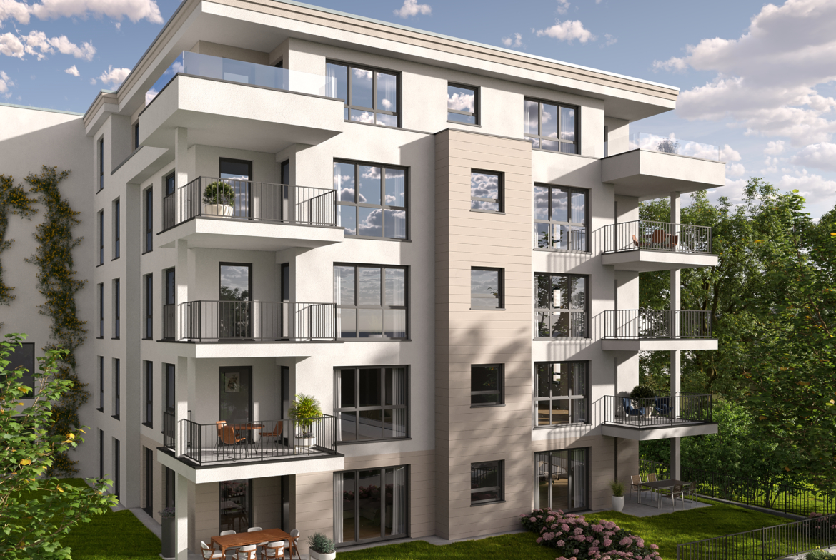 Das Gebäude ist mit viel Gefühl in das Umfeld eingefügt. Die modernen Wohnungen überzeugen durch ihre gelungene Verbindung von Licht, Exklusivität und optimaler Nutzungsmöglichkeit. Die Wirkung der bodentiefen Fenster mit feinen Unterteilungen wird durch die transparenten Balkonbrüstungen unterstrichen. Farben, Formen und Materialien sind harmonisch aufeinander abgestimmt.