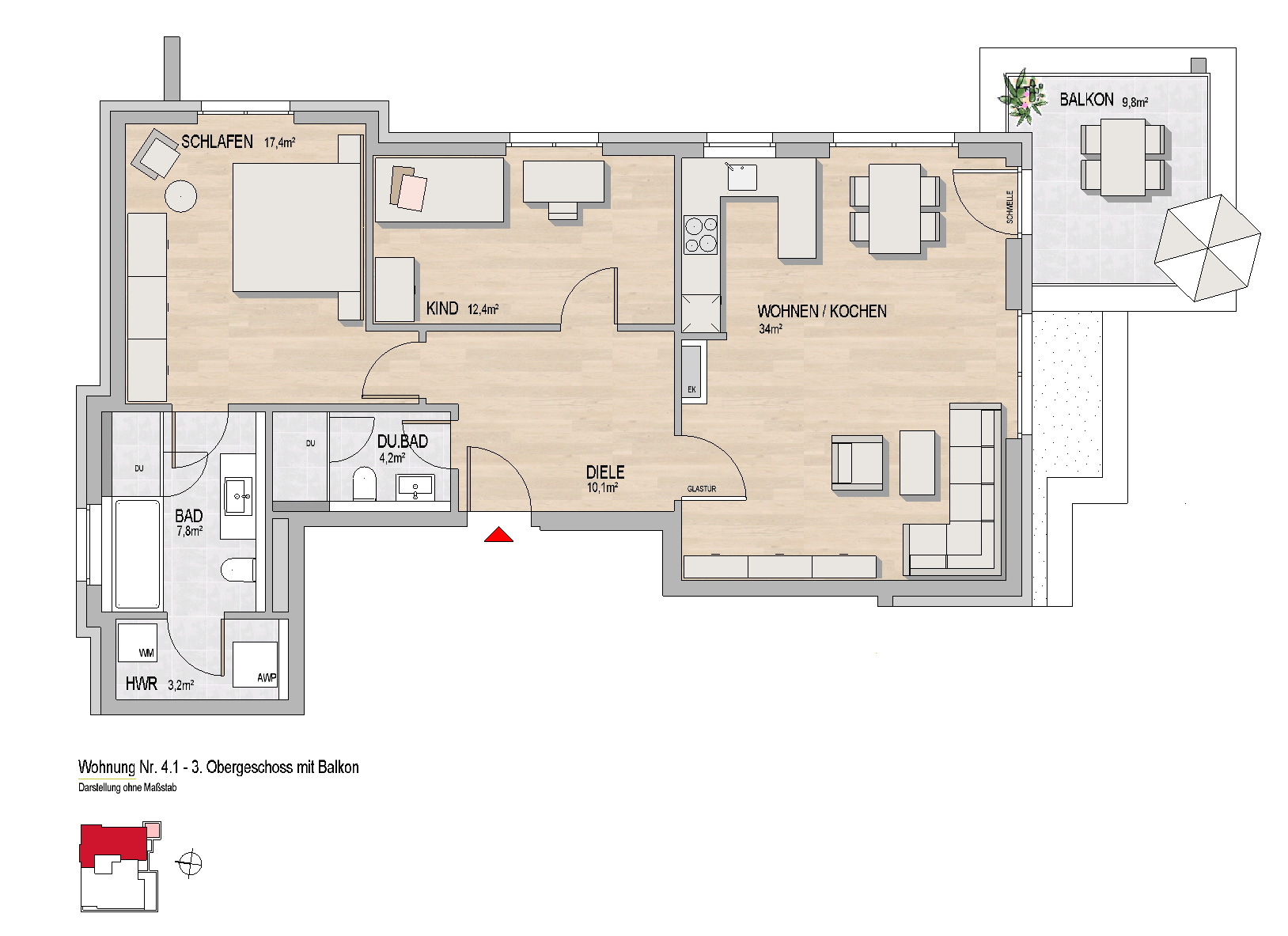 Kunststoff-Fenster mit Wärmedämmverglasung, Elektrische Raffstores aus Aluminium, Schallhemmende Wohnungseingangstüren mit Weitwinkelspion und Mehrfachverriegelung, Bäder mit Badewanne und bodentiefer Dusche mit Klarglas Abtrennung, Hochwertige Bodenbeläge Hauswirtschaftsraum mit Abluftwärmepumpe,