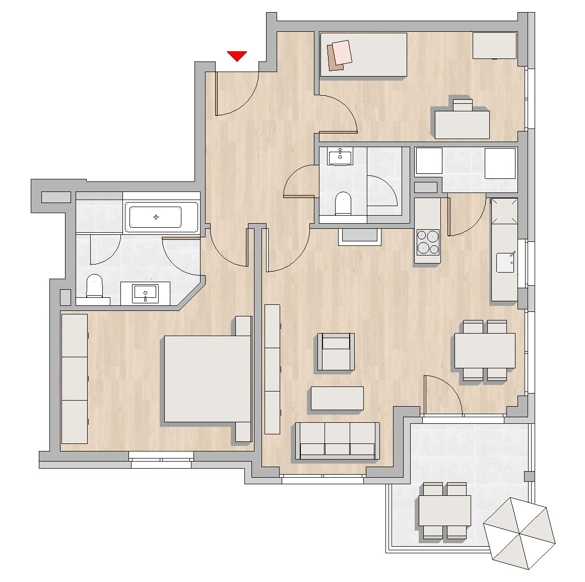 ist mit viel Gefühl in das Umfeld eingefügt. Die modernen Wohnungen überzeugen durch ihre gelungene Verbindung von Licht, Exklusivität und optimaler Nutzungsmöglichkeit. Die Wirkung der bodentiefen Fenster mit feinen Unterteilungen wird durch die transparenten Balkonbrüstungen unterstrichen. Farben, Formen und Materialien sind harmonisch aufeinander abgestimmt.