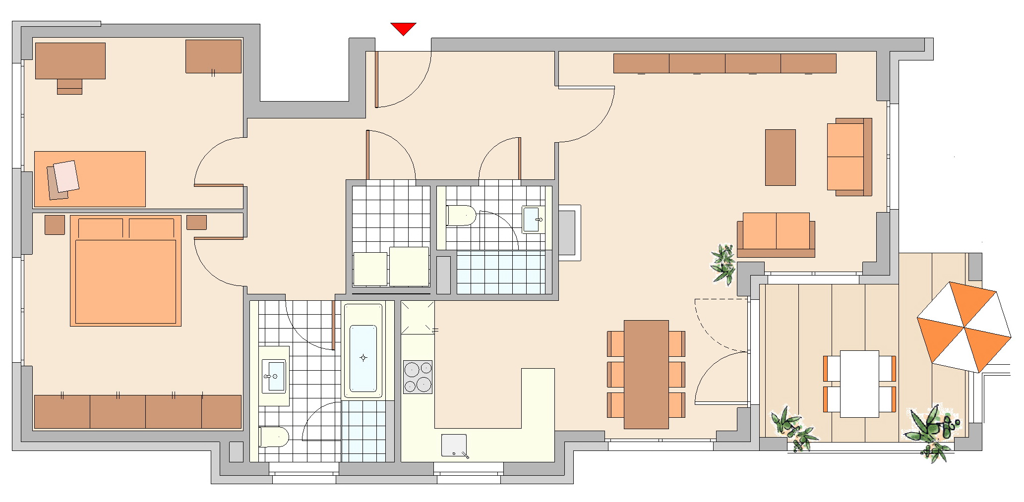 Es werden Kunststoff-Fenster mit Wärmedämmverglasung eingesetzt. Die Beschläge als Einhand-Dreh-Kipp- oder Einhand-Dreh-Beschläge in verdeckter Ausführung. Die Fenster in den Erdgeschoss-Wohnungen und die Fenster im Bereich der Balkone im 1. Obergeschoss erhalten einbruchhemmende Beschläge. Alle Fenster, Balkon- und Terrassentüren der Wohnungen in der senkrechten Fassade erhalten elektrisch betriebene Raffstores aus pulverbeschichtetem Aluminium. Die Badezimmerfenster in der Fassade werden in satiniertem Glas ausgeführt. Die Wohnungseingangstüren in schallhemmender Ausführung erhalten einen Weitwinkelspion. Zu Ihrer Sicherung sind eine Mehrfachverriegelung sowie eine Türsprechanlage mit integriertem Videoüberwachungssystem vorgesehen. Die Wandfliesen in den Bädern und Duschbädern werden im Bereich der Dusche raumhoch und an den restlichen Wandflächen halbhoch ausgeführt. Der bodengleiche Duschbereich mit Ablaufrinne und Fliesenmulde erhält eine Klarglas-Duschabtrennung. Über der Waschtischanlage wird in gleicher Breite ein Lichtspiegel montiert. Moderne Deckenspots sorgen für das passende Licht im Bad. Küchen, Bäder und Gäste-WCs erhalten Fliesenboden nach Wahl aus unserem Sortiment. Die Wohn- und Schlafbereiche sowie Dielen erhalten einen Bodenbelag nach Mustervorlage mit passender Sockelleiste. Decken und Wände der Wohnungen werden mit Malervliestapete tapeziert und weiß angelegt. Die Wohnung ist mit einem Multimedia-Verteilerkasten sowie einer großen Zahl Elektroschaltern und Steckdosen ausgestattet. Telefonanschlüsse und TV-Kabel nach Wahl. Die Wohnungen werden durch eine Fußbodenheizung beheizt. Hierfür wird im Hauswirtschaftsraum der Wohnung eine Abluftwärmepumpe zum Heizen, Lüften und für die Warmwasseraufbereitung installiert. Die Steuerung der Temperatur erfolgt in jedem Raum individuell. Die Wohnungen erhalten einen elektrisch betriebenen Kamin im Stil eines offenen Kamins mit feuerfester Verglasung. Zu jeder Wohnung gehört ein Kellerraum. Für die Bewohner des Hauses steht ein Gemeinschaftsraum sowie ein Müllraum zur Verfügung. Ein Personenaufzug, für jeweils bis zu 8 Personen, verbindet alle Etagen des Hauses miteinander. Der Aufzug ist von der Untergeschossebene, den Hauseingängen und in den Geschossen stufenfrei erreichbar. Zur Erhöhung Ihrer Sicherheit wird der Zugang von der Tiefgarage ins Haus alarmgesichert. Um Ihnen die Wahl unter den Mustern und Farben zu erleichtern haben wir in unserer Firmenzentrale einen Bemusterungsbereich eingerichtet. Hier können Sie in aller Ruhe unter fachmännischer Beratung das für Sie Passende auswählen.
